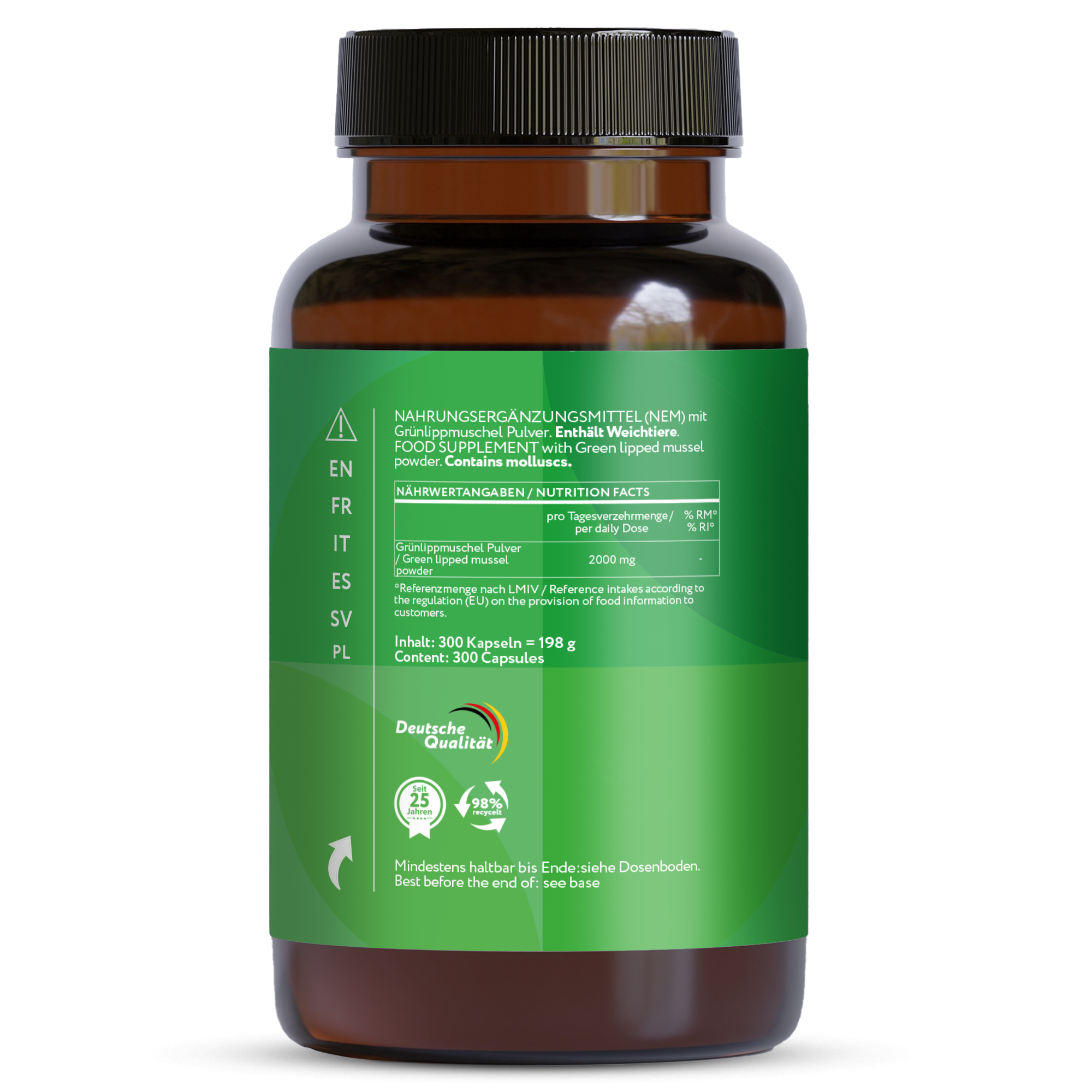 Zutaten: Grünlippmuschel Pulver (Perna canaliculus) (Weichtiere), Kapselhülle (Gelatine vom Rind).