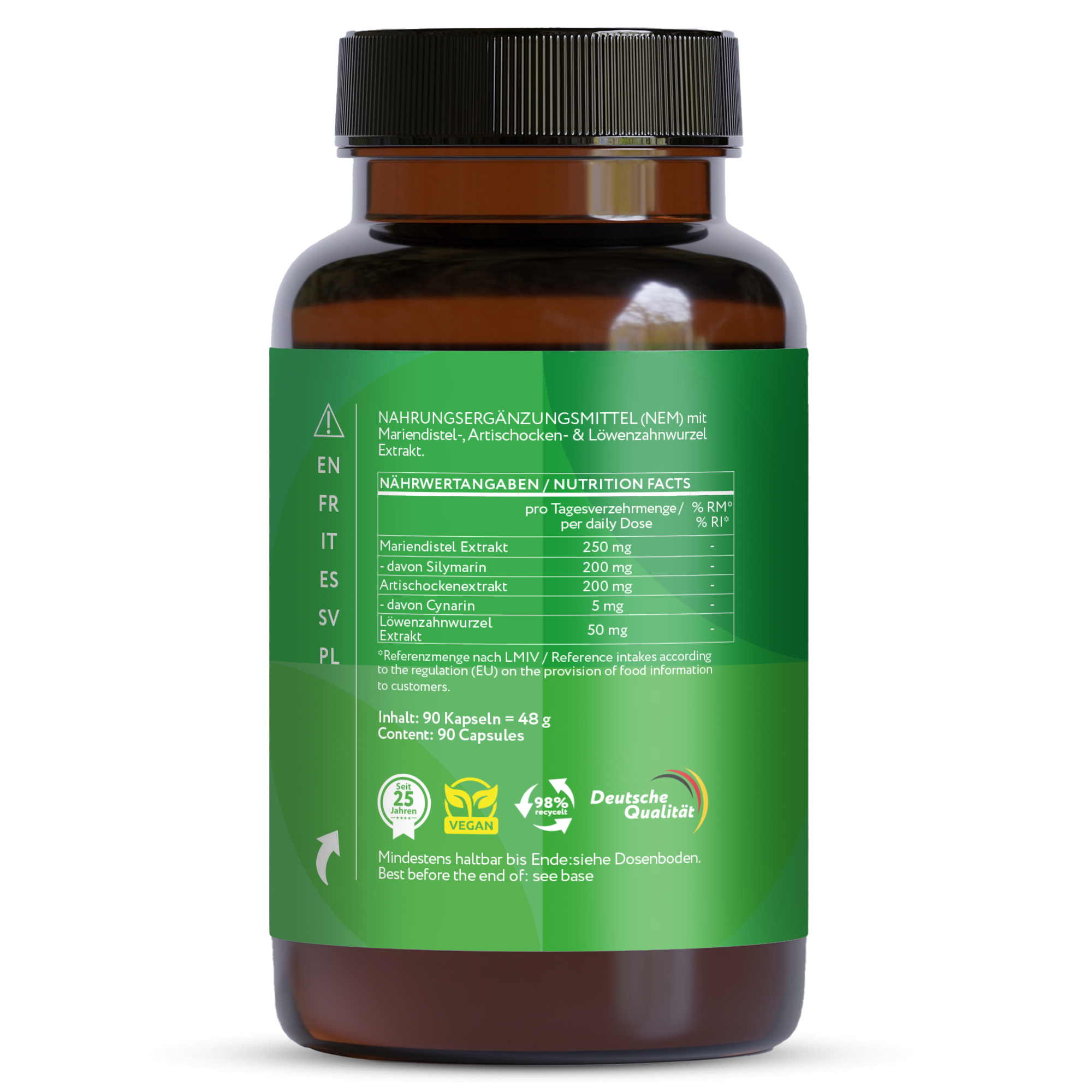 Zutaten: Mariendistel Extrakt, Artischocken Extrakt, Löwenzahnwurzel Extrakt, Kapselhülle: Hydroxypropylmethylcellulose (pflanzlich).